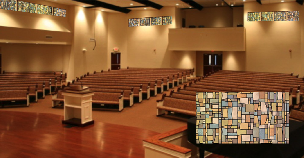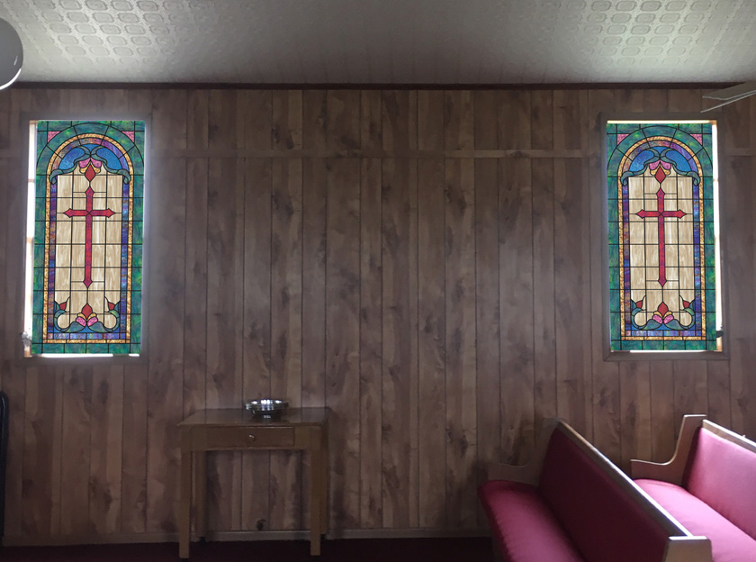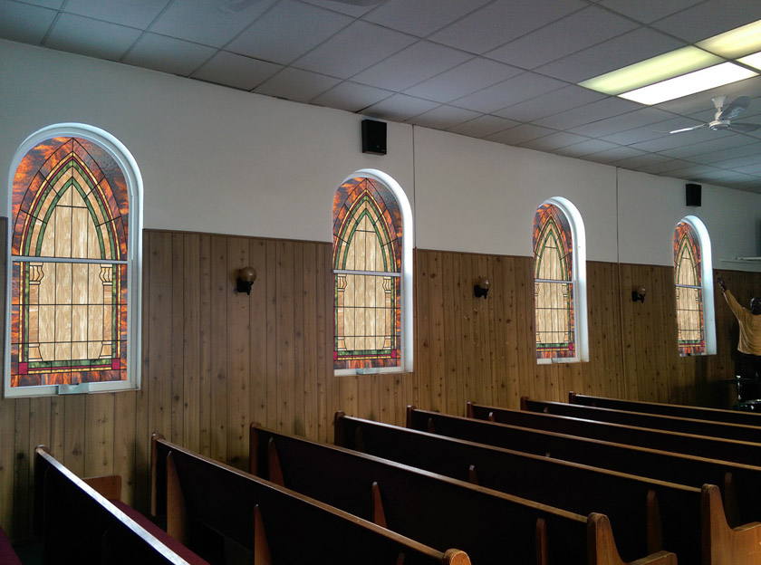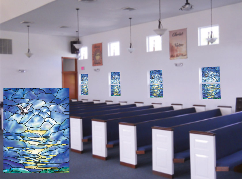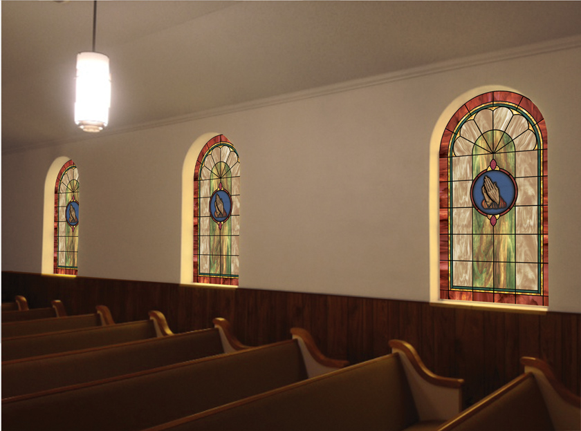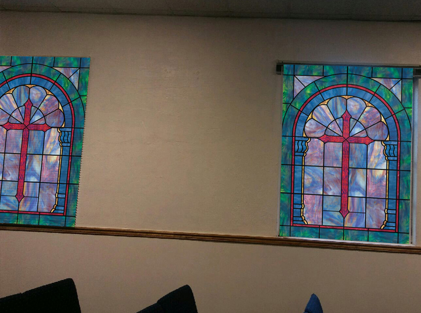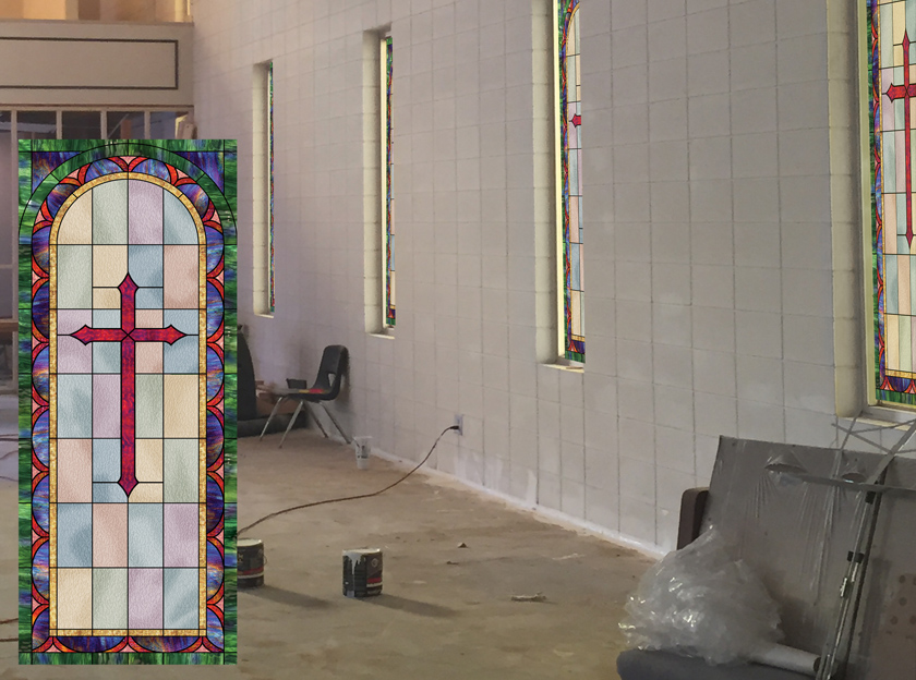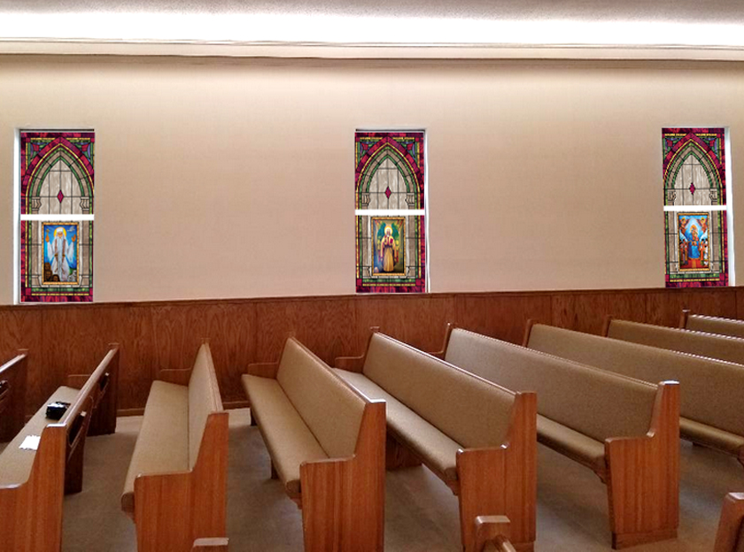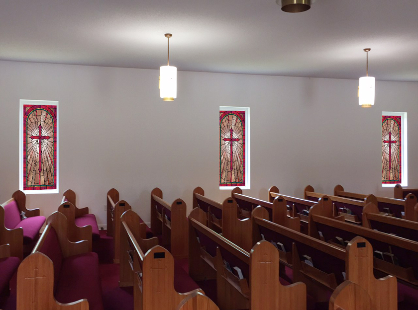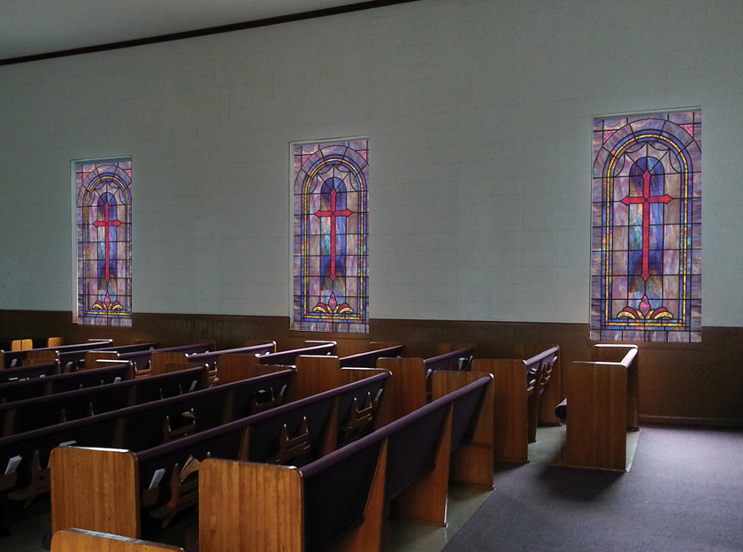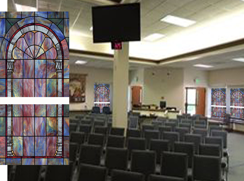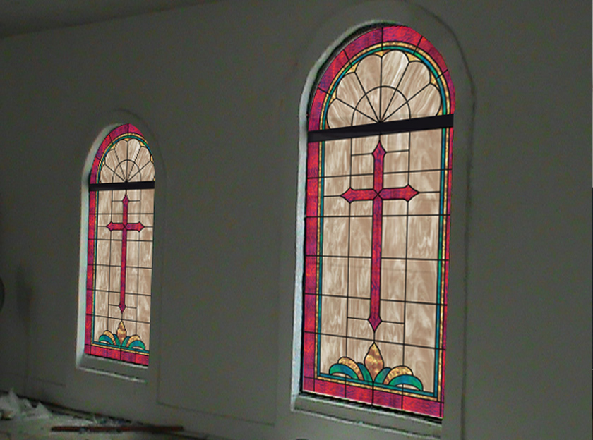 Our Church Window Film® designs transform spaces from small to large, arched or squared, double hung or solid, in any type of church or building. View our gallery photos below, highlighting various ways in which our films can be used, use these pictures for inspiration. All our designs can be transformed and configured into your size and shape window, CALL US at 800-291-3739 with any questions. Click HERE to view our NEW PINTEREST Page!!!
