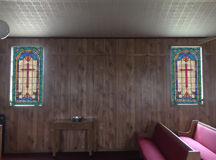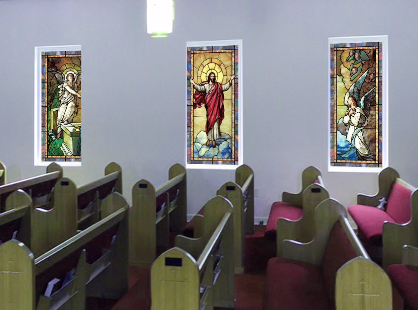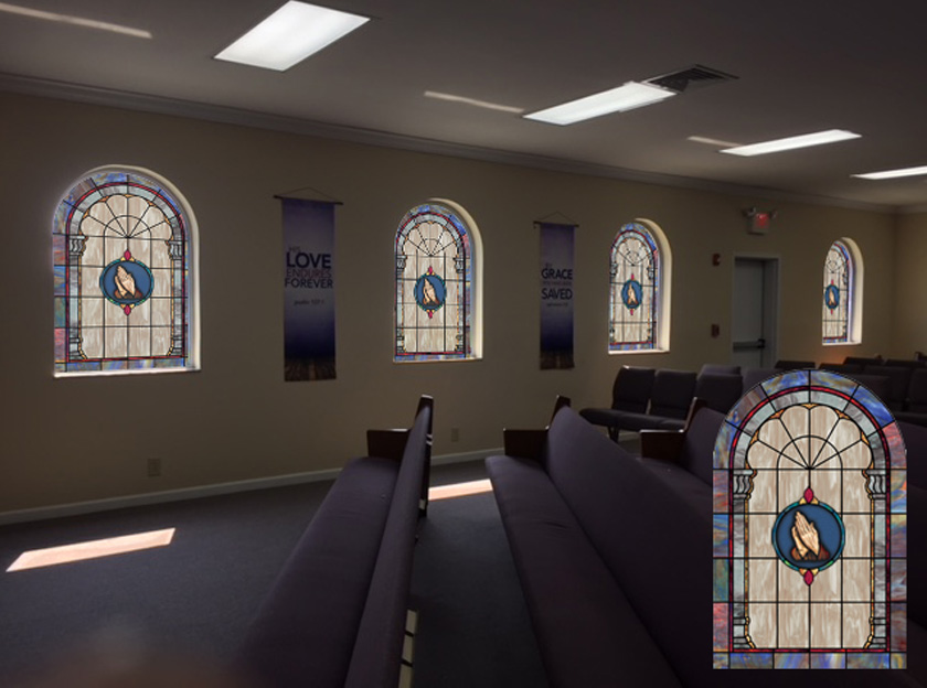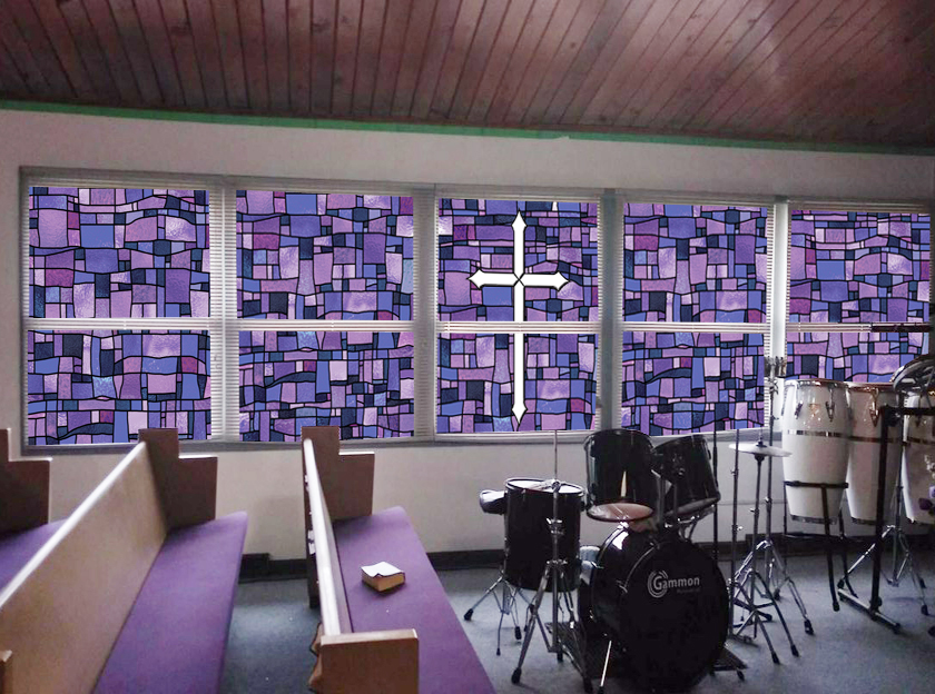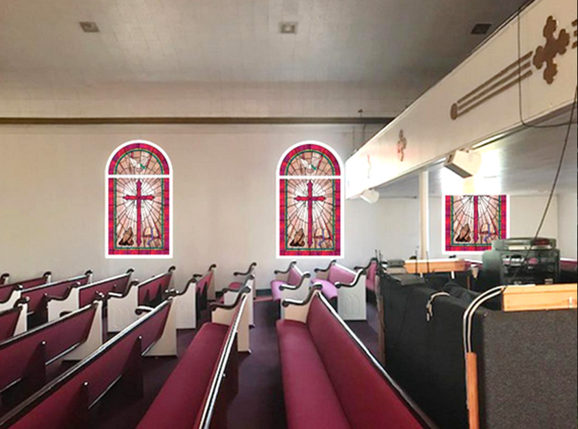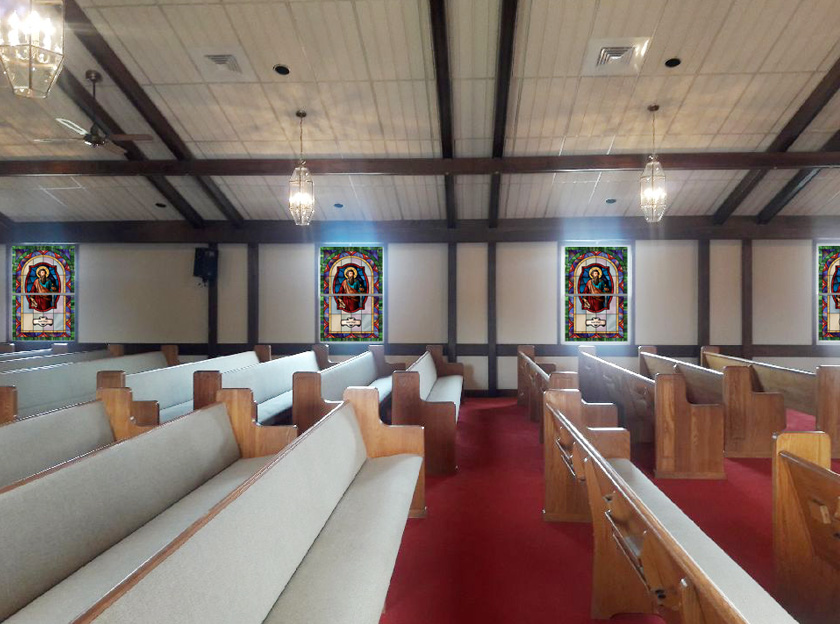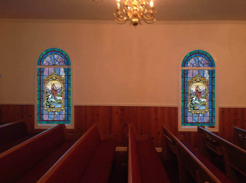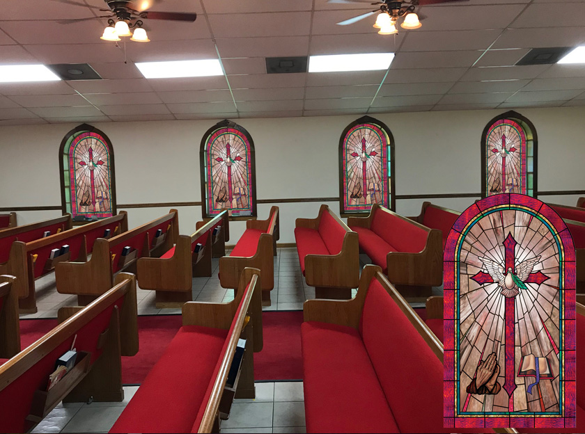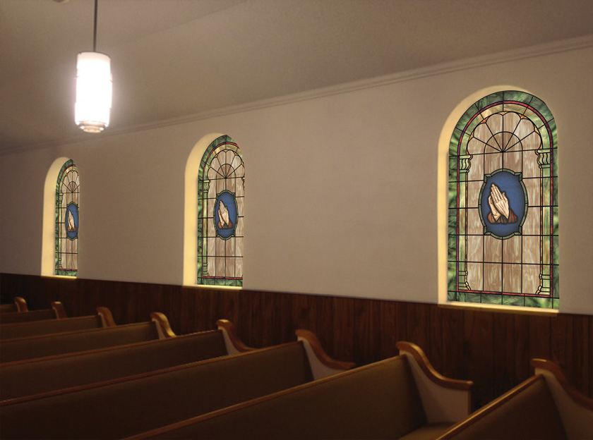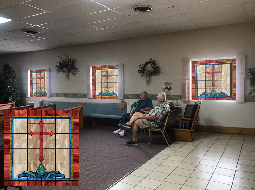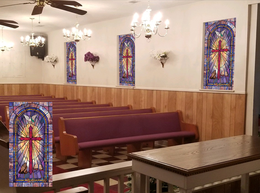 Our Church Window Film® designs transform spaces from small to large, arched or squared, double hung or solid, in any type of church or building. View our gallery photos below, highlighting various ways in which our films can be used, use these pictures for inspiration. All our designs can be transformed and configured into your size and shape window, CALL US at 800-291-3739 with any questions. Click HERE to view our NEW PINTEREST Page!!!
