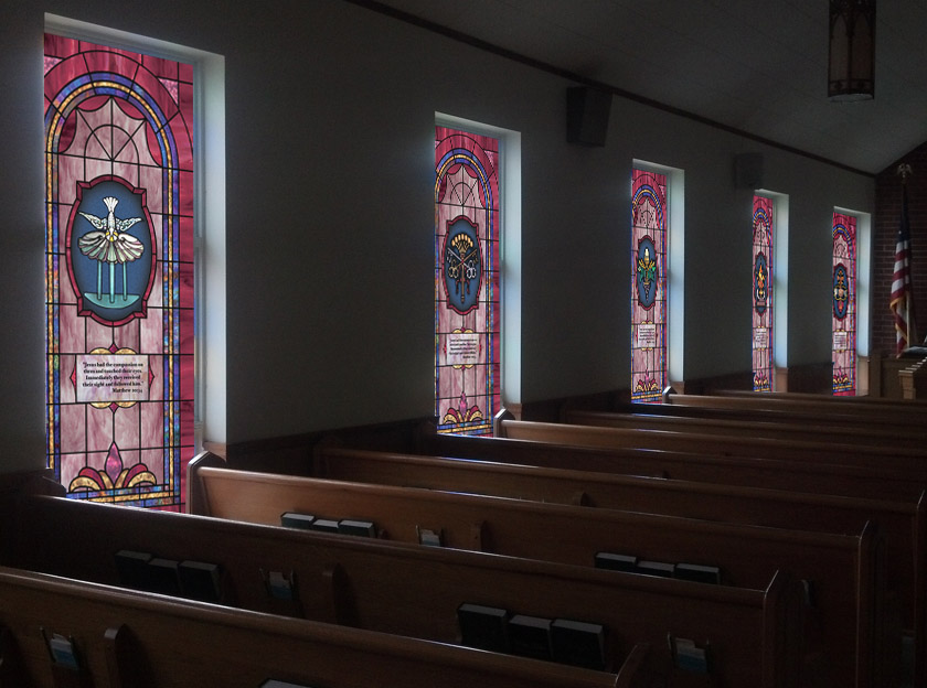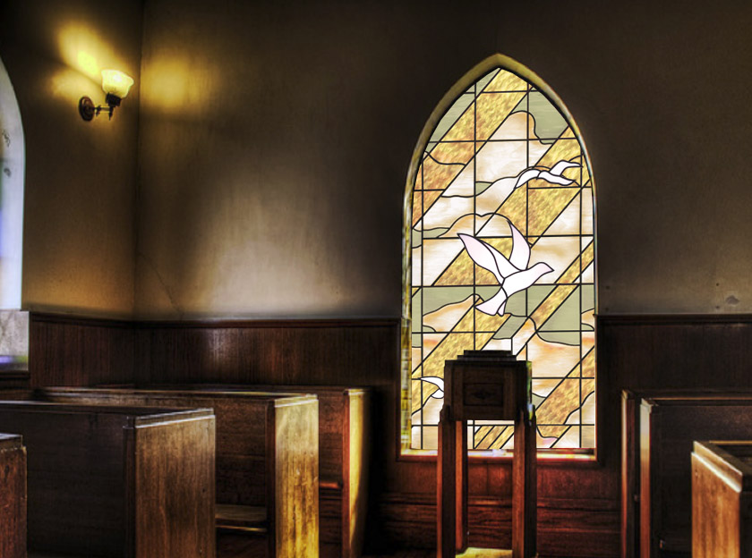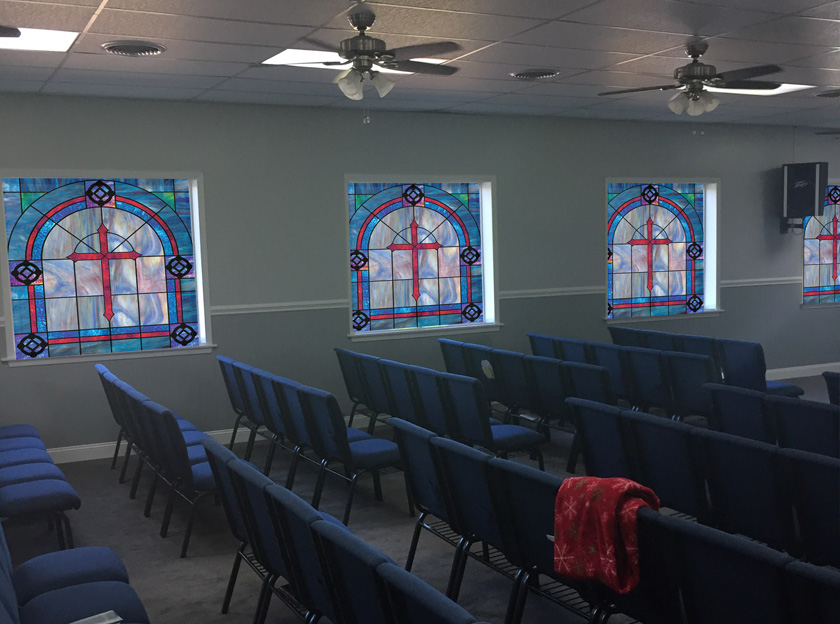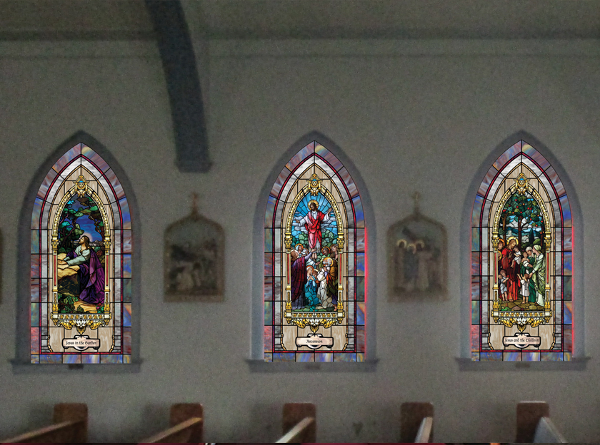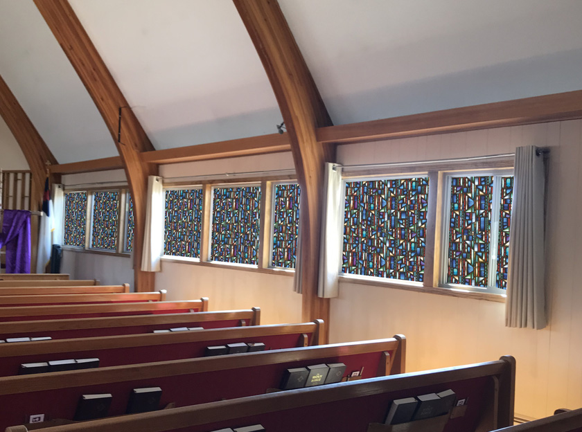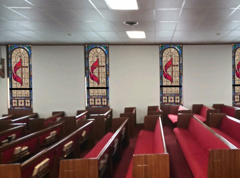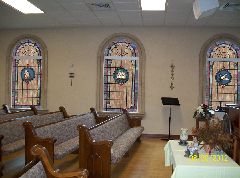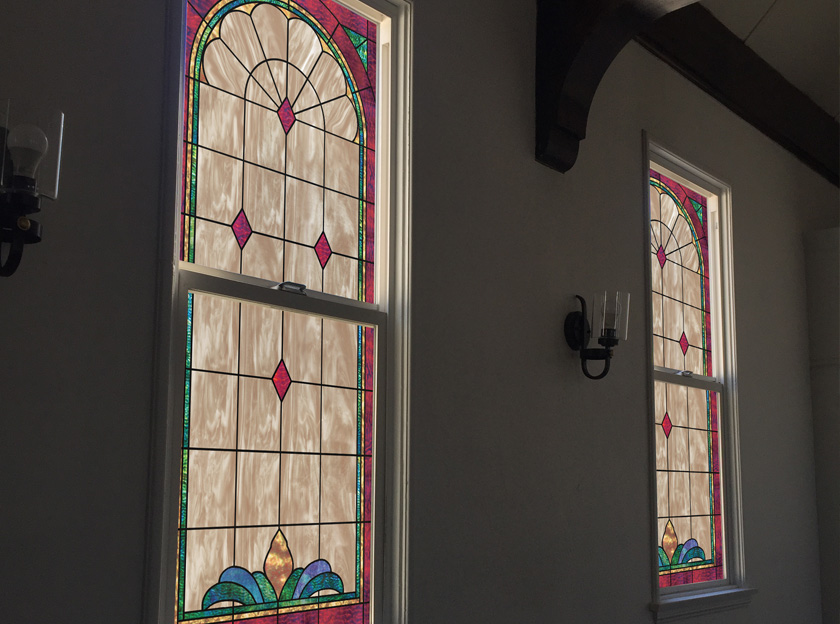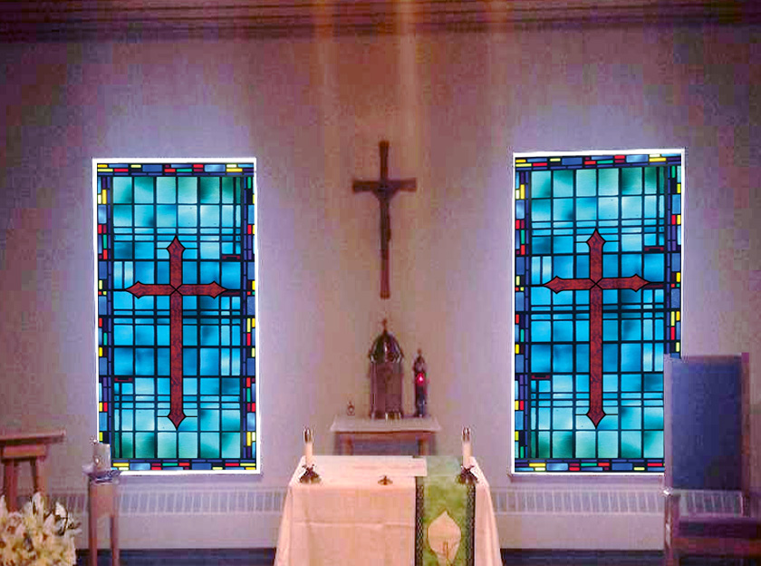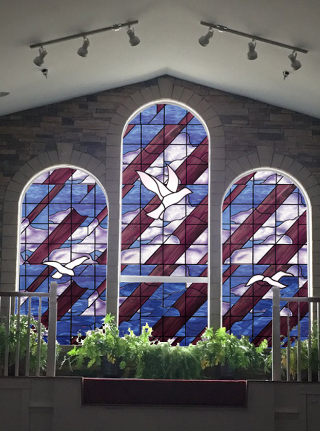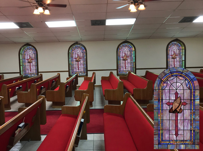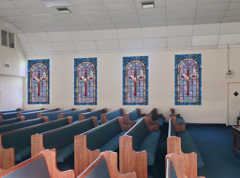 Our Church Window Film® designs transform spaces from small to large, arched or squared, double hung or solid, in any type of church or building. View our gallery photos below, highlighting various ways in which our films can be used, use these pictures for inspiration. All our designs can be transformed and configured into your size and shape window, CALL US at 800-291-3739 with any questions. Click HERE to view our NEW PINTEREST Page!!!