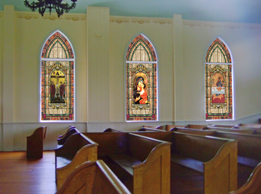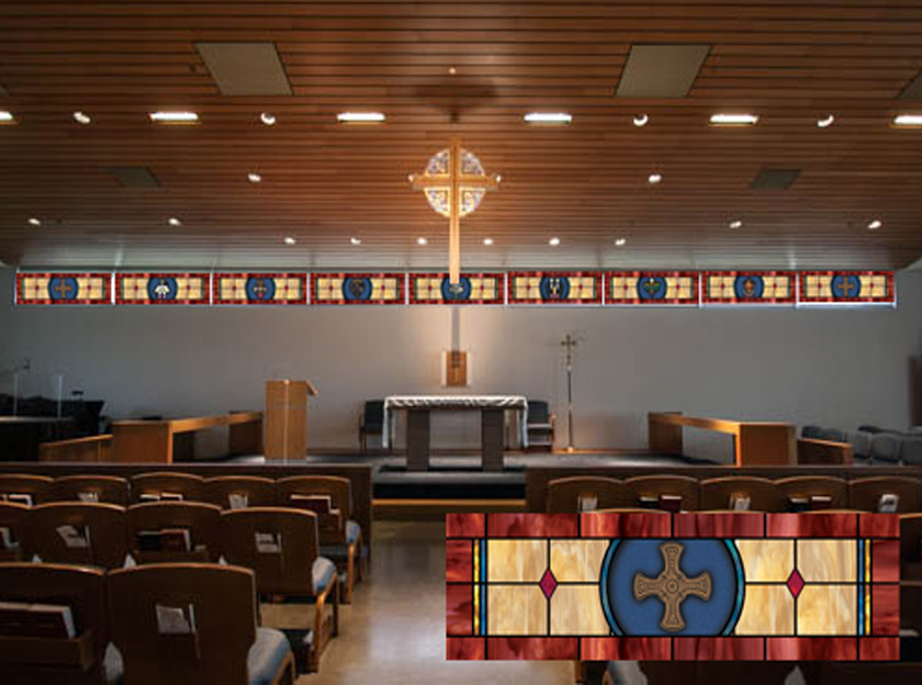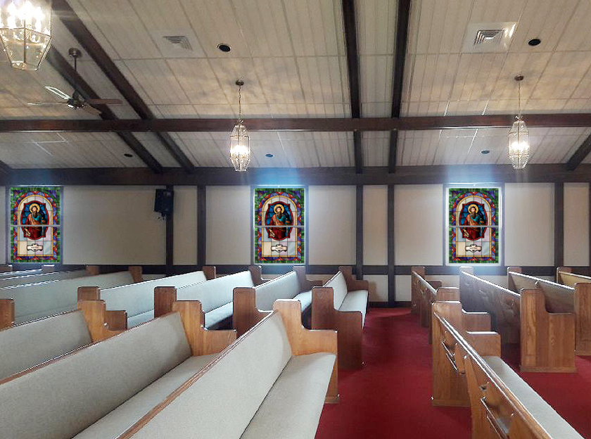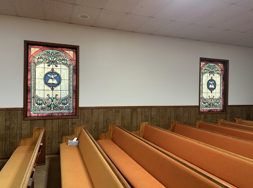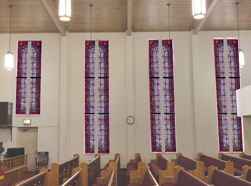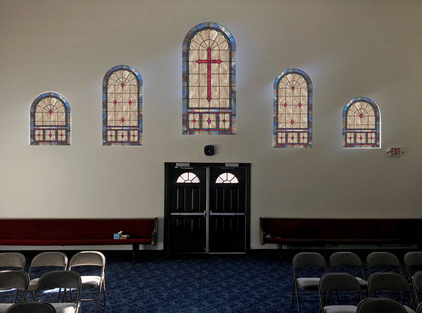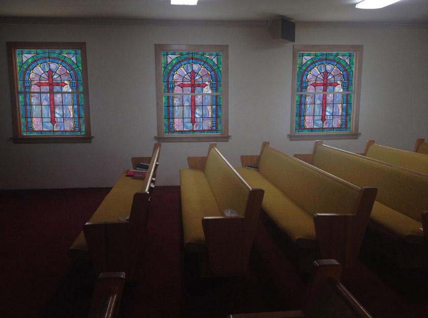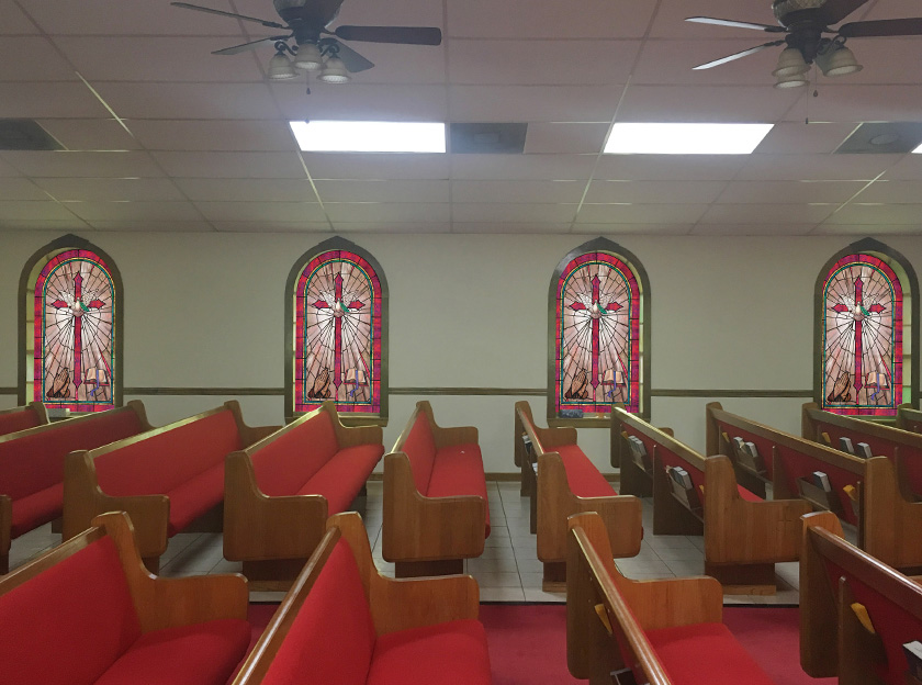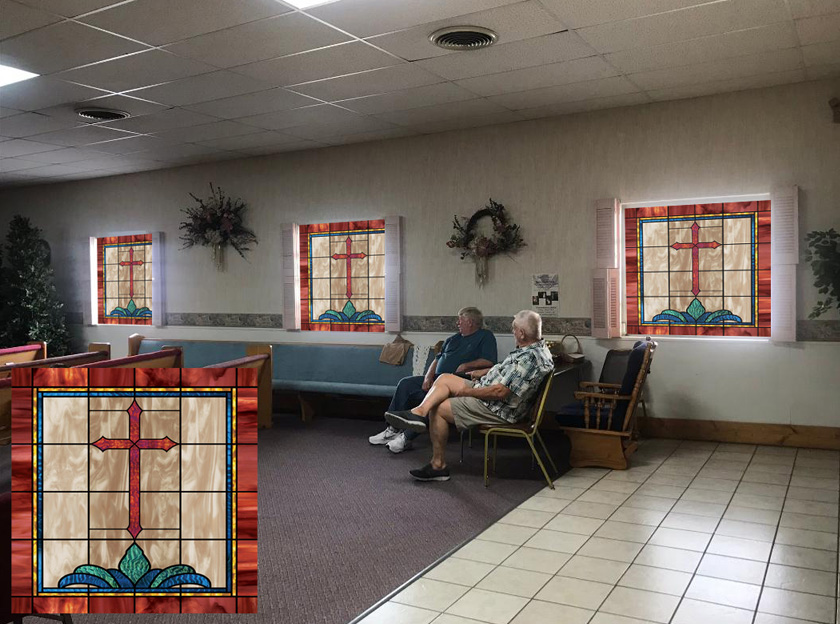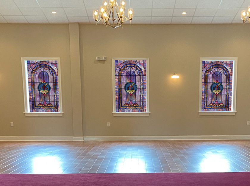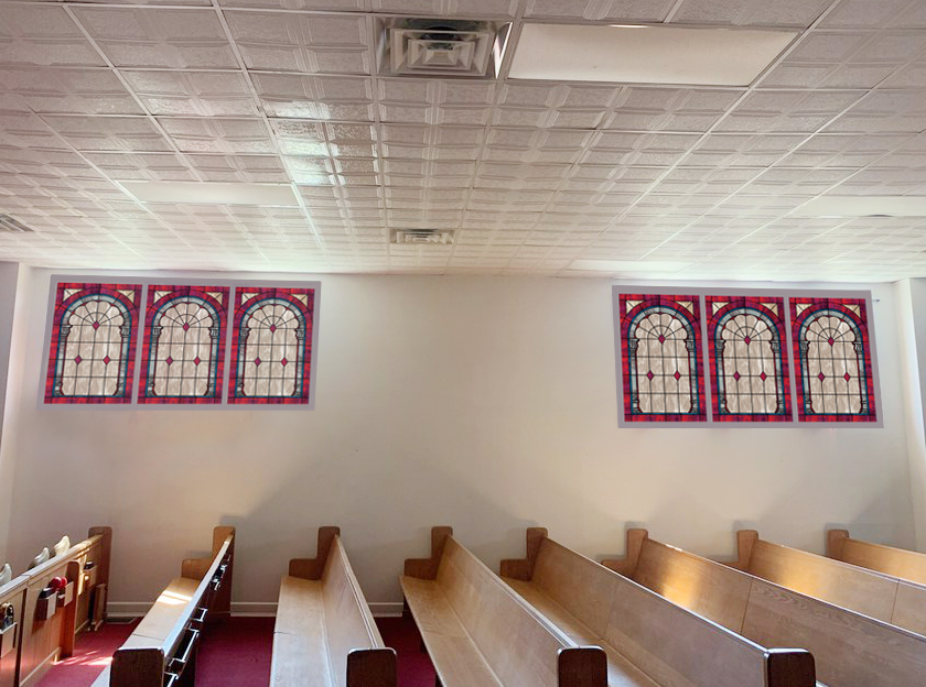 Our Church Window Film® designs transform spaces from small to large, arched or squared, double hung or solid, in any type of church or building. View our gallery photos below, highlighting various ways in which our films can be used, use these pictures for inspiration. All our designs can be transformed and configured into your size and shape window, CALL US at 800-291-3739 with any questions. Click HERE to view our NEW PINTEREST Page!!!