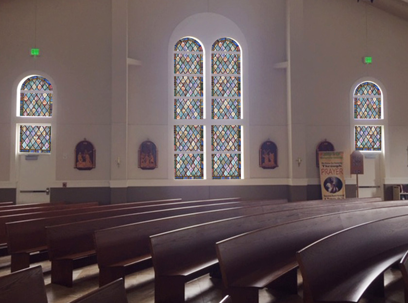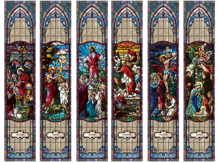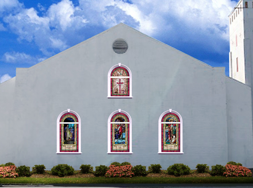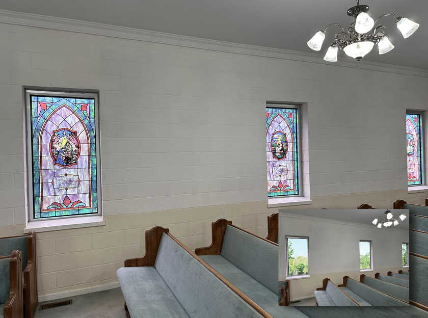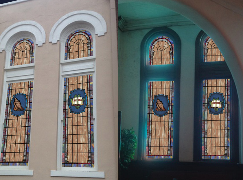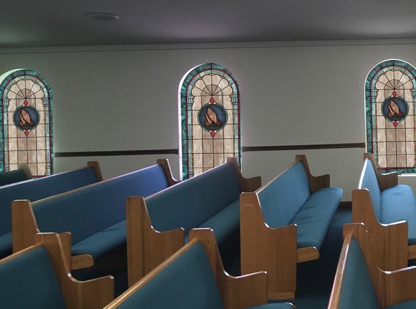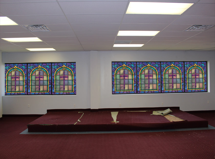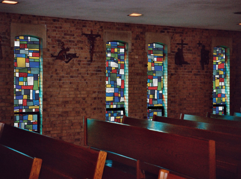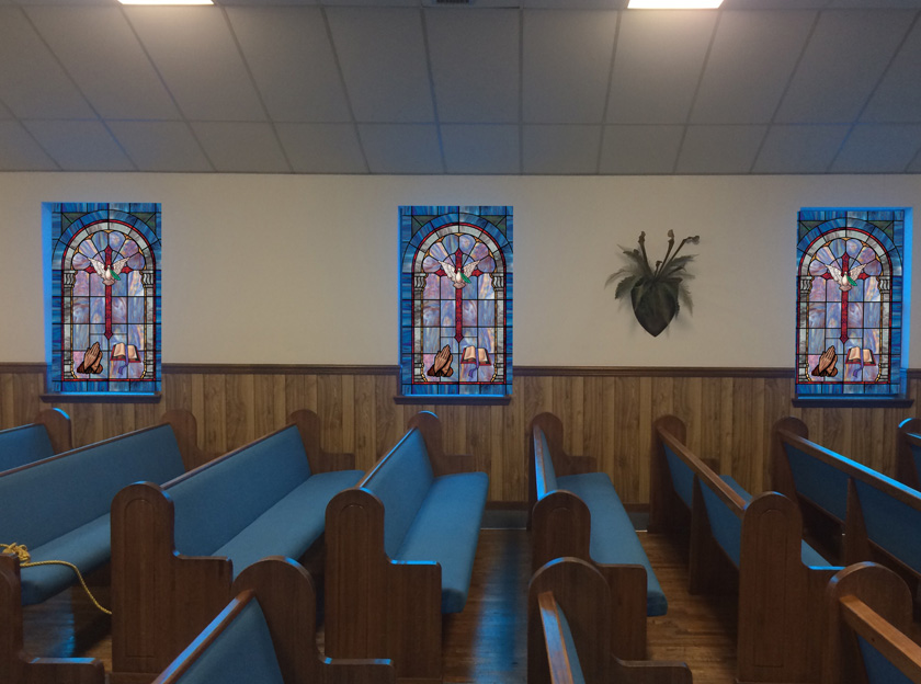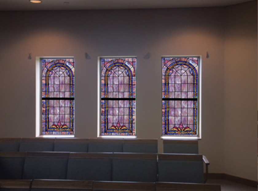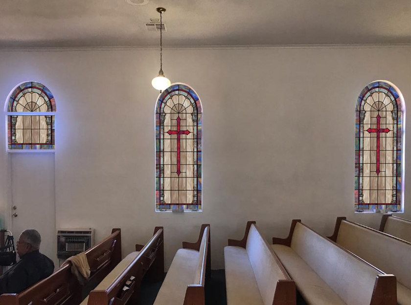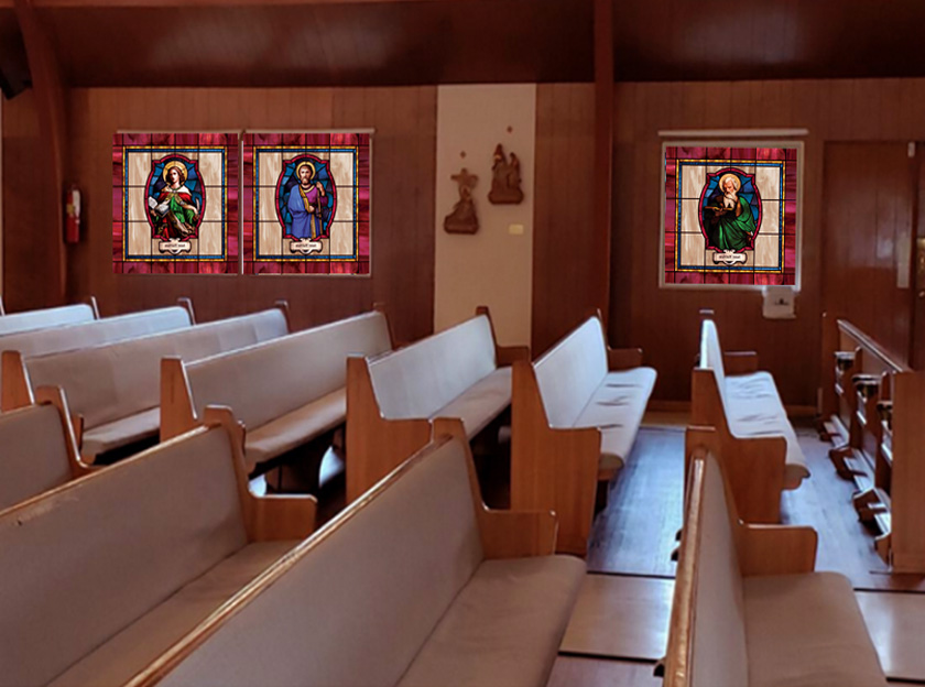 Our Church Window Film® designs transform spaces from small to large, arched or squared, double hung or solid, in any type of church or building. View our gallery photos below, highlighting various ways in which our films can be used, use these pictures for inspiration. All our designs can be transformed and configured into your size and shape window, CALL US at 800-291-3739 with any questions. Click HERE to view our NEW PINTEREST Page!!!