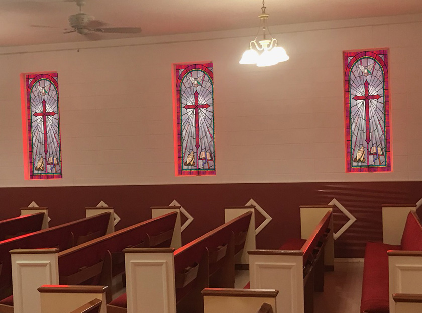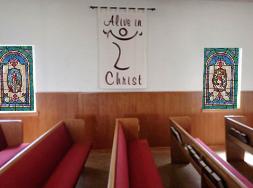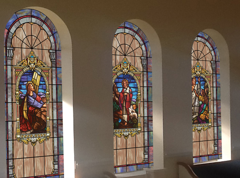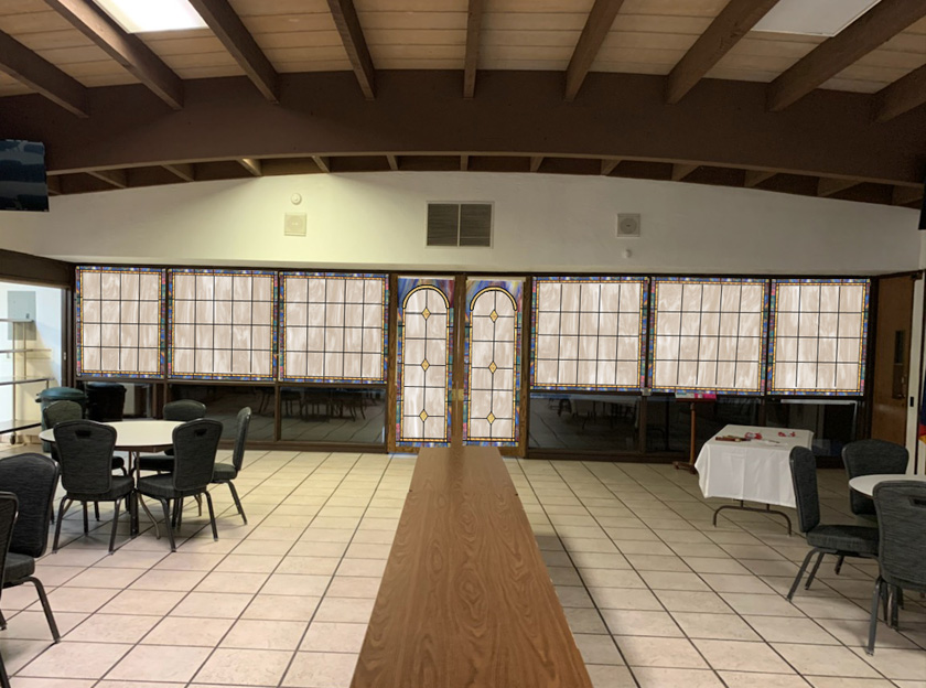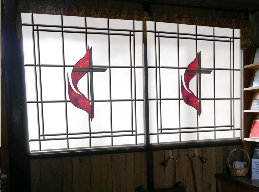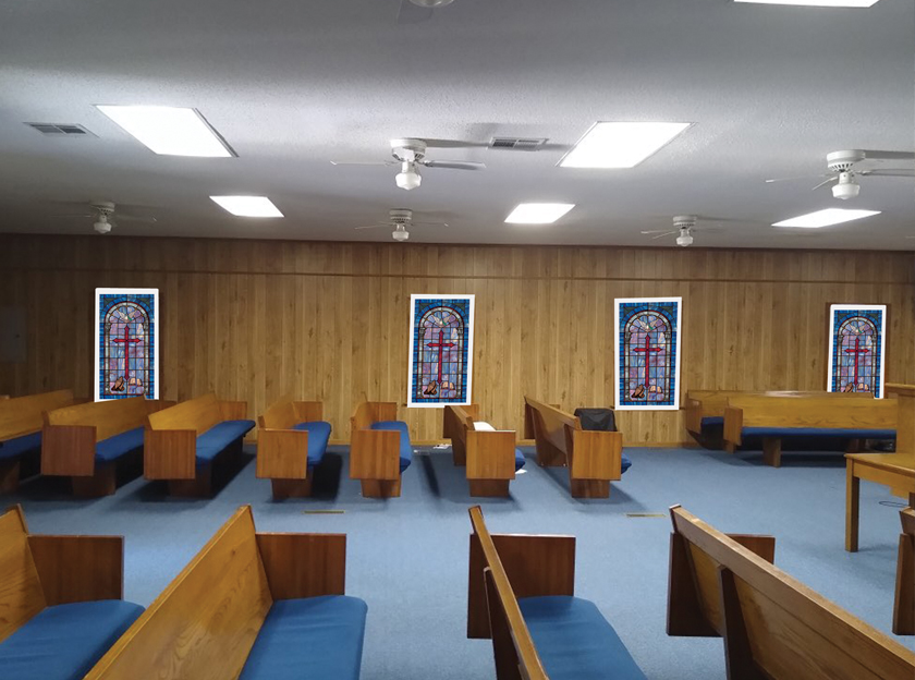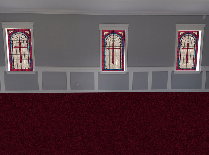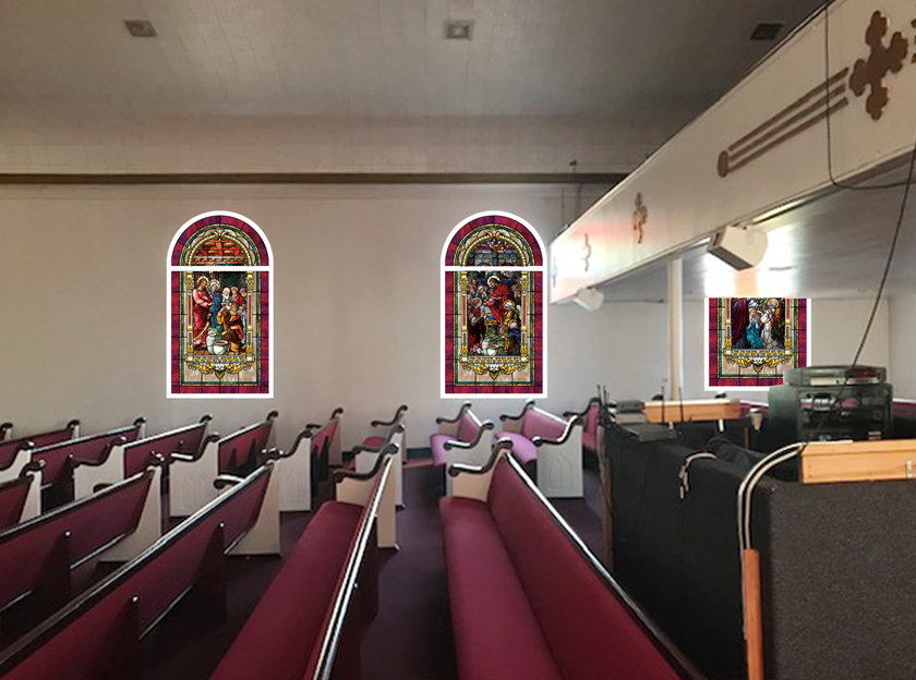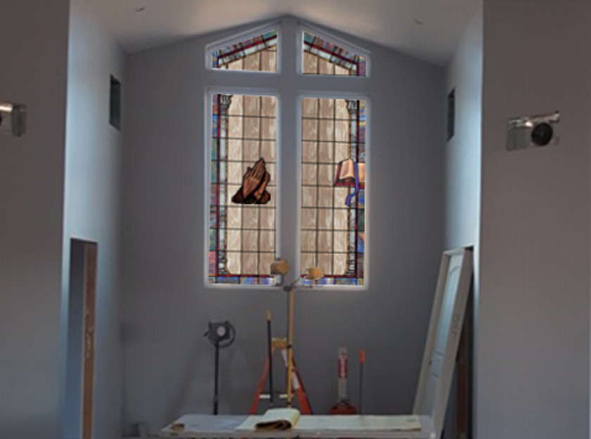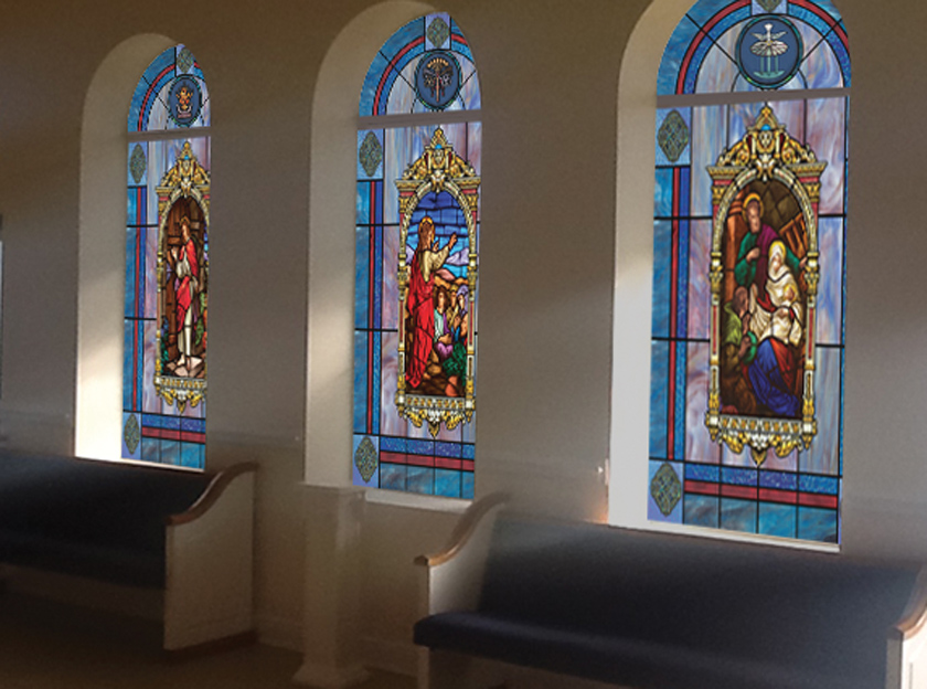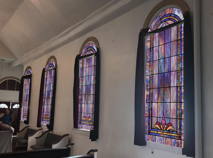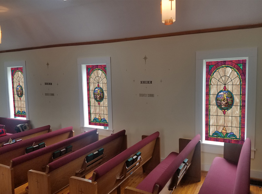Our Church Window Film® designs transform spaces from small to large, arched or squared, double hung or solid, in any type of church or building. View our gallery photos below, highlighting various ways in which our films can be used, use these pictures for inspiration. All our designs can be transformed and configured into your size and shape window, CALL US at 800-291-3739 with any questions. Click HERE to view our NEW PINTEREST Page!!!