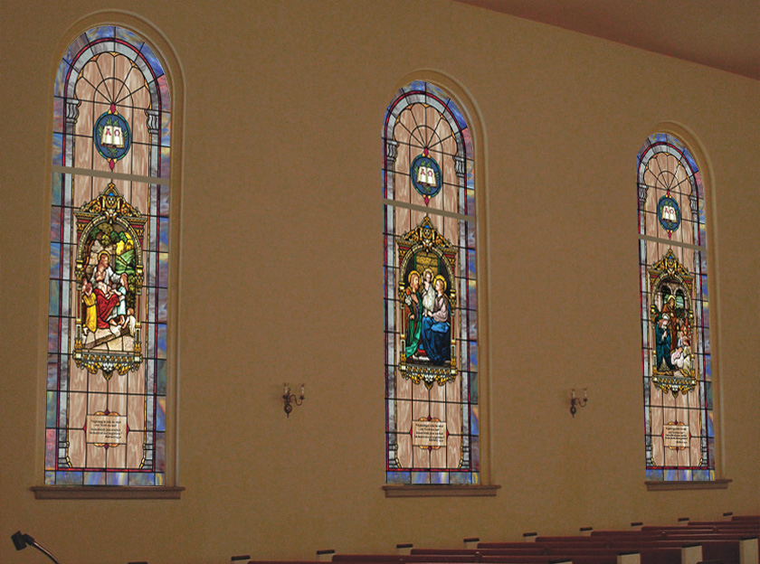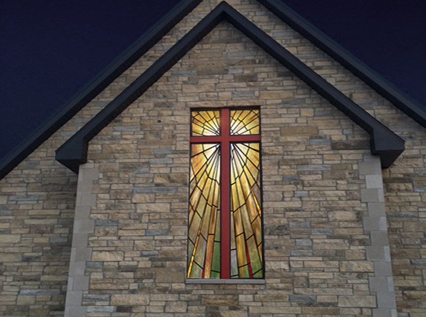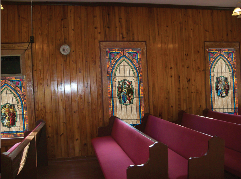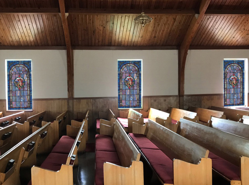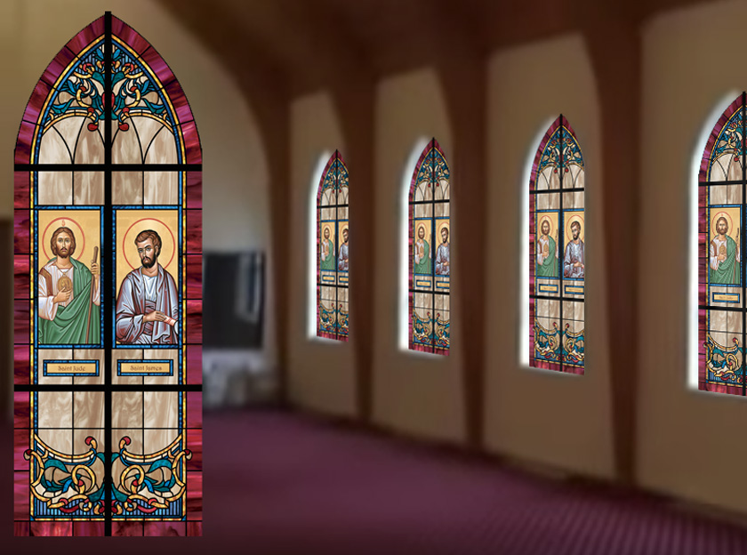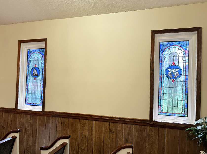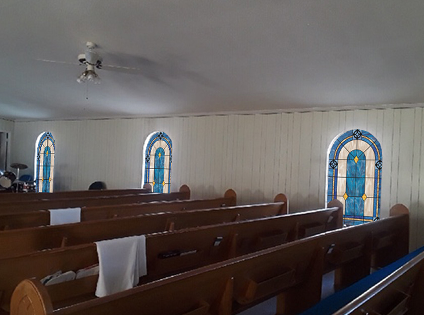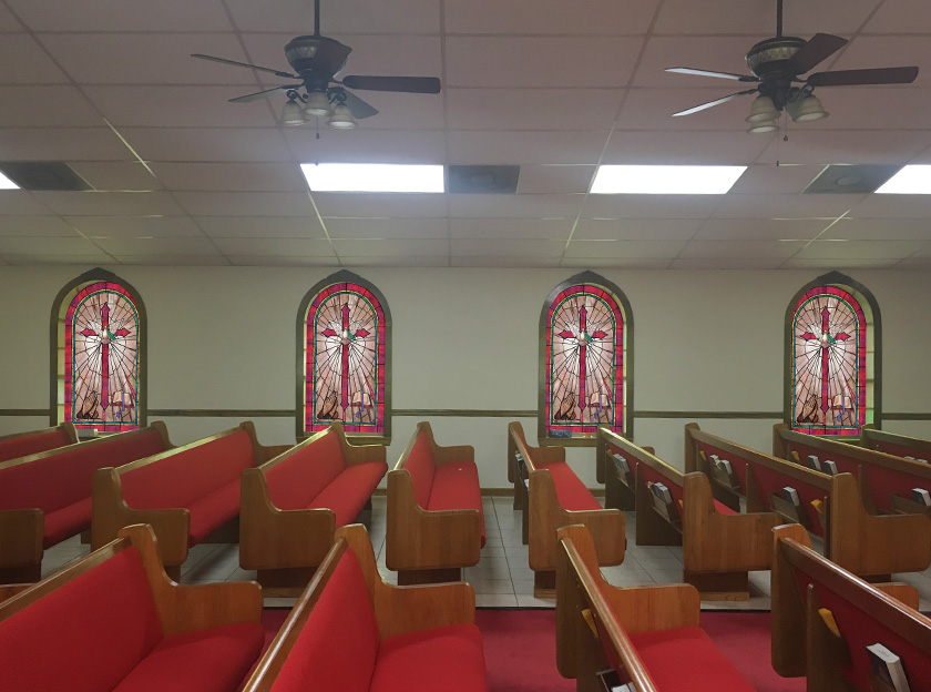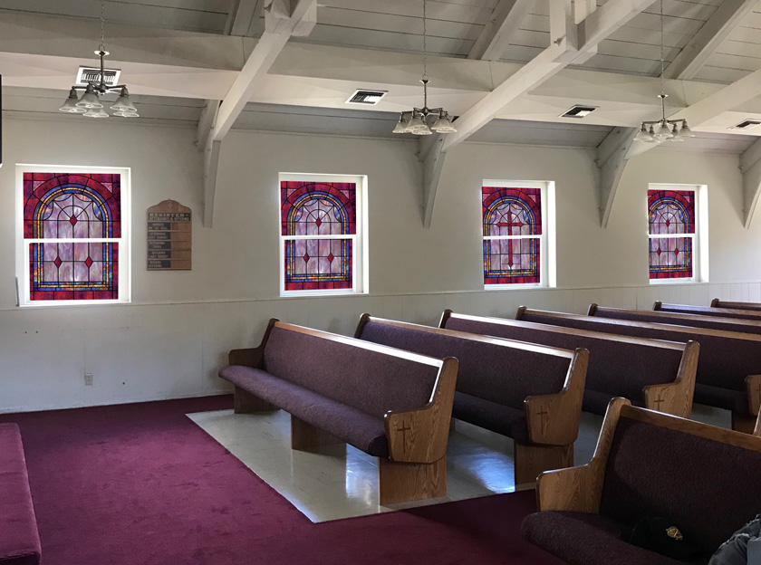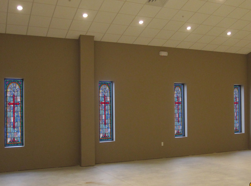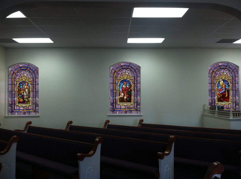 Our Church Window Film® designs transform spaces from small to large, arched or squared, double hung or solid, in any type of church or building. View our gallery photos below, highlighting various ways in which our films can be used, use these pictures for inspiration. All our designs can be transformed and configured into your size and shape window, CALL US at 800-291-3739 with any questions. Click HERE to view our NEW PINTEREST Page!!!