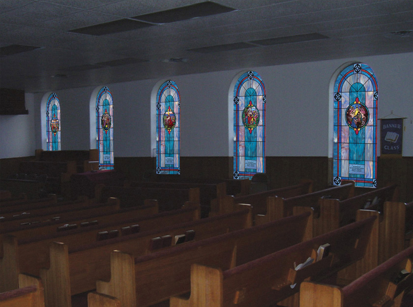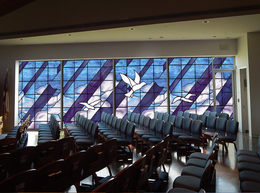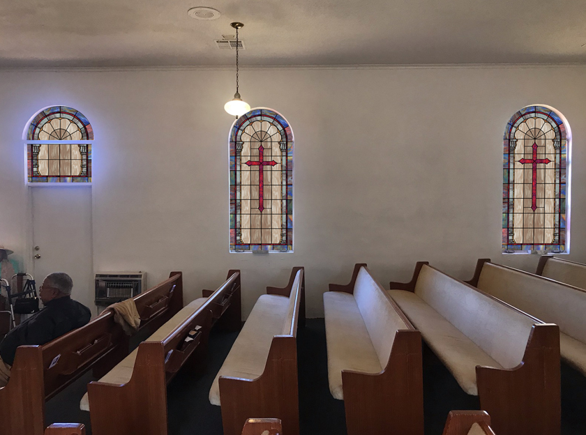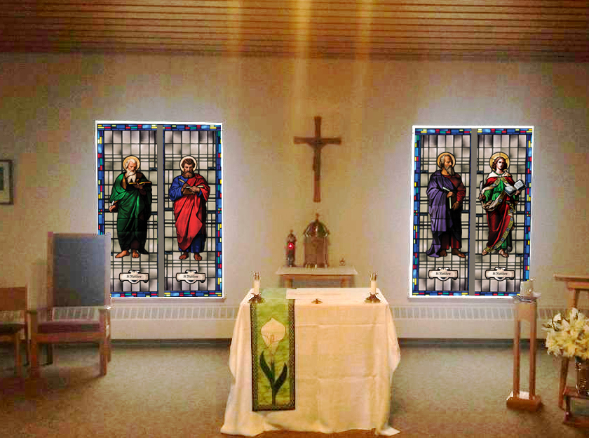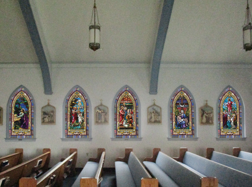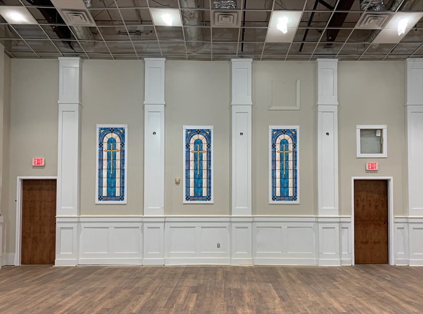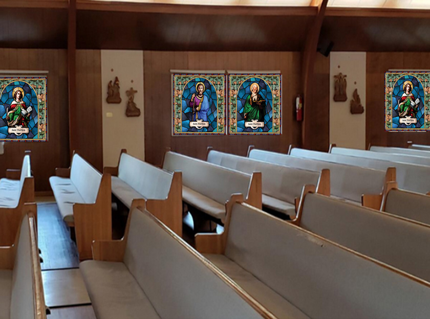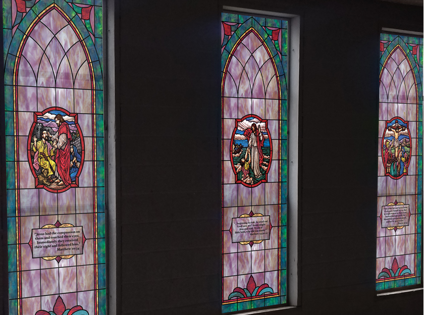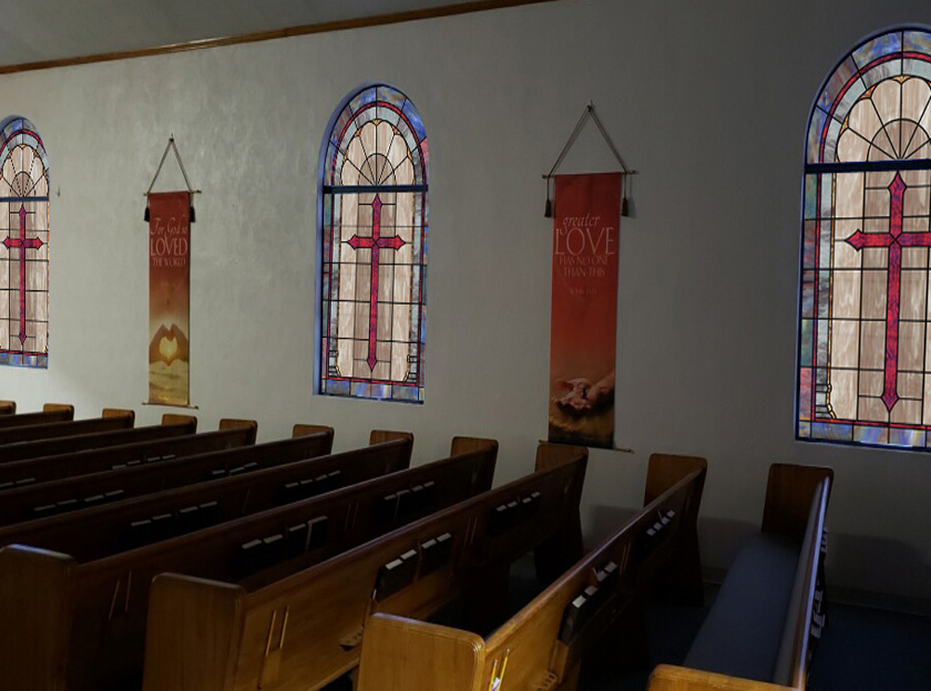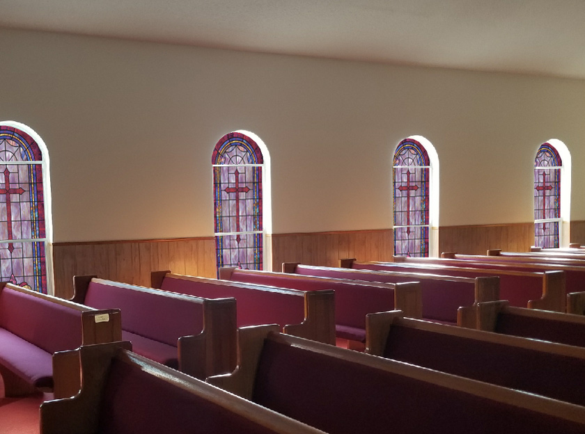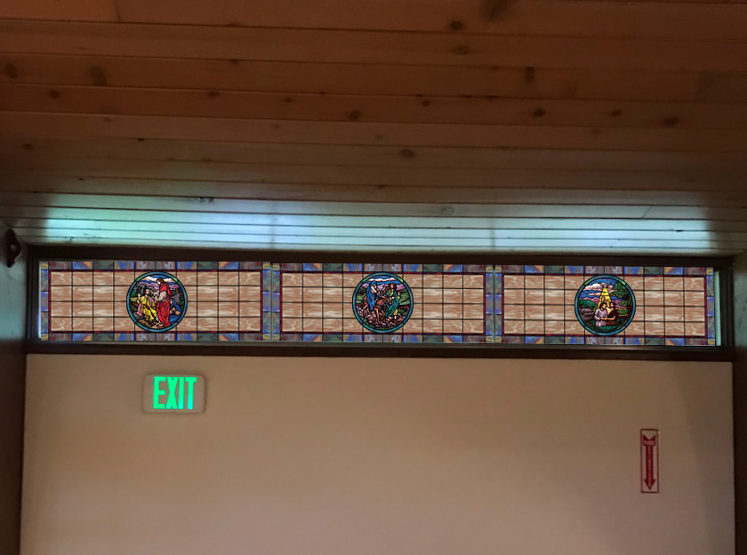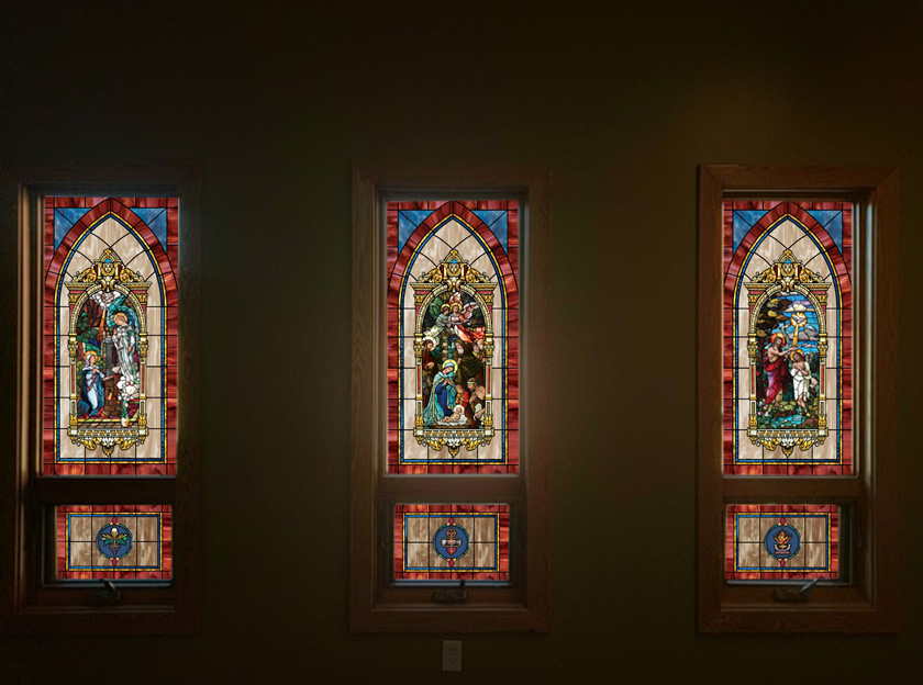 Our Church Window Film® designs transform spaces from small to large, arched or squared, double hung or solid, in any type of church or building. View our gallery photos below, highlighting various ways in which our films can be used, use these pictures for inspiration. All our designs can be transformed and configured into your size and shape window, CALL US at 800-291-3739 with any questions. Click HERE to view our NEW PINTEREST Page!!!