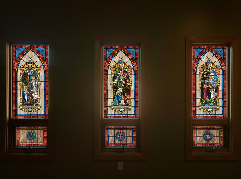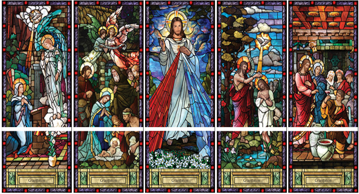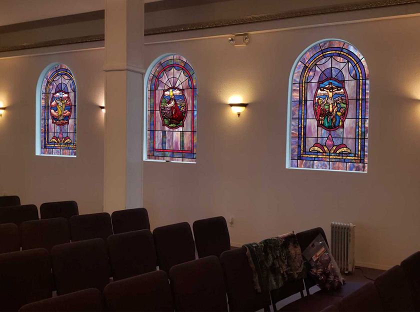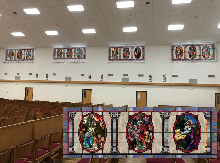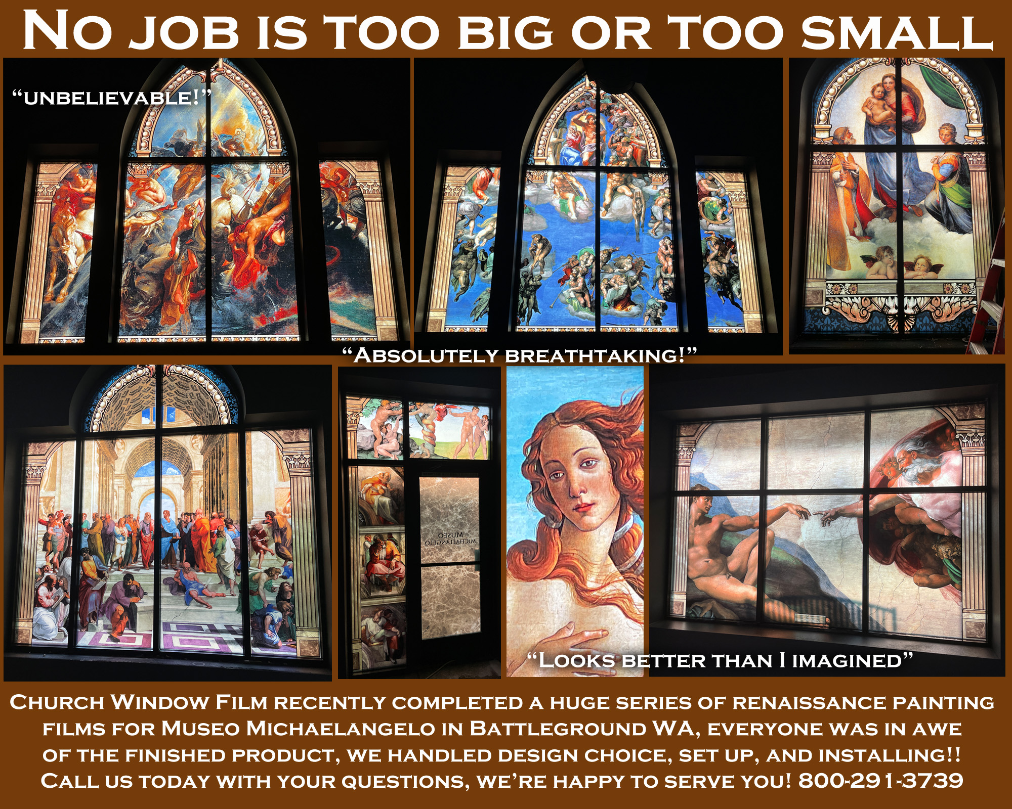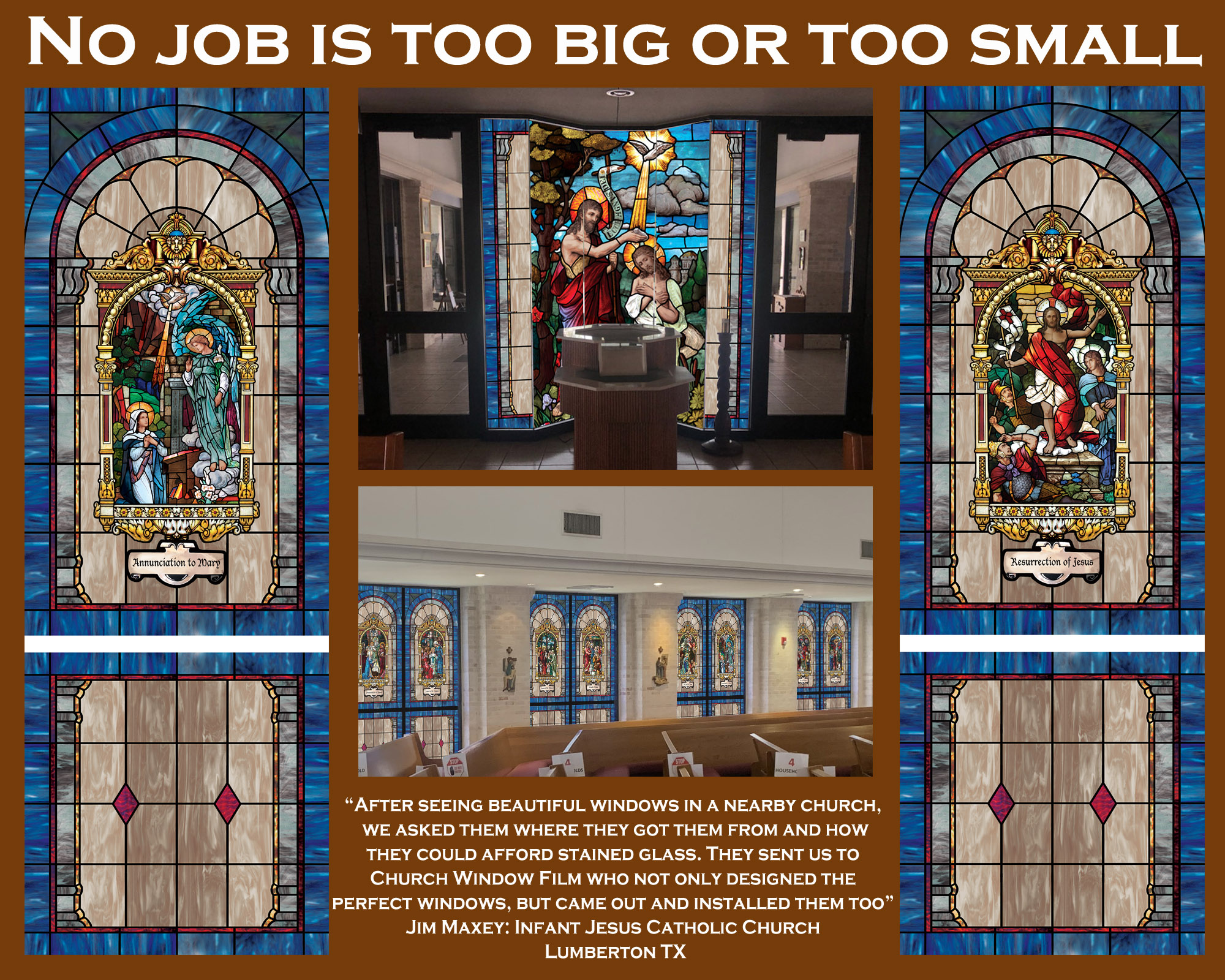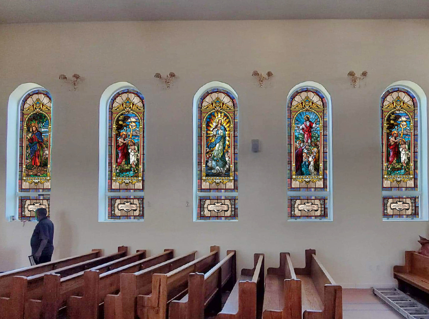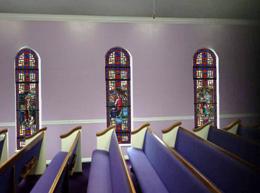 Our Church Window Film® designs transform spaces from small to large, arched or squared, double hung or solid, in any type of church or building. View our gallery photos below, highlighting various ways in which our films can be used, use these pictures for inspiration. All our designs can be transformed and configured into your size and shape window, CALL US at 800-291-3739 with any questions. Click HERE to view our NEW PINTEREST Page!!!