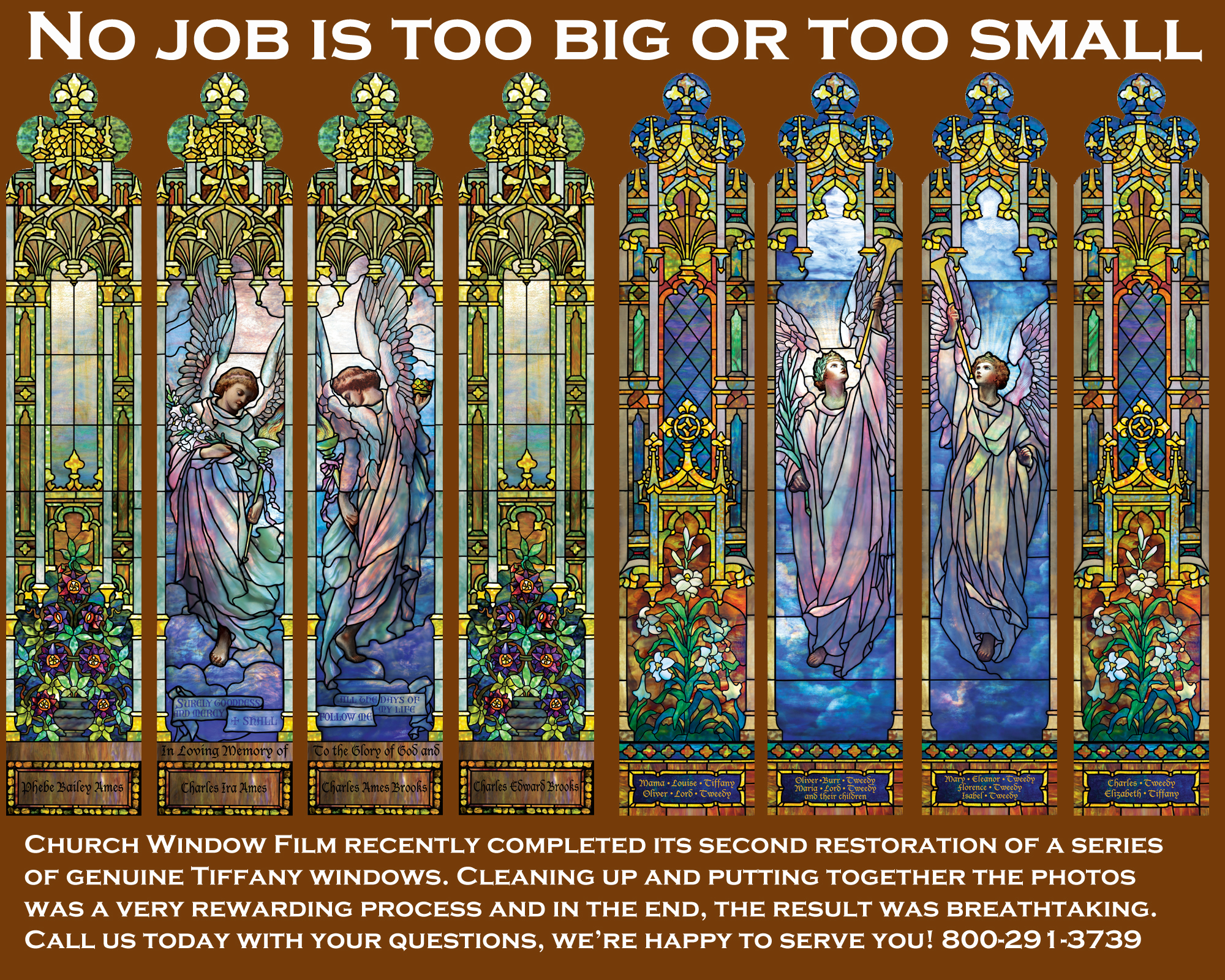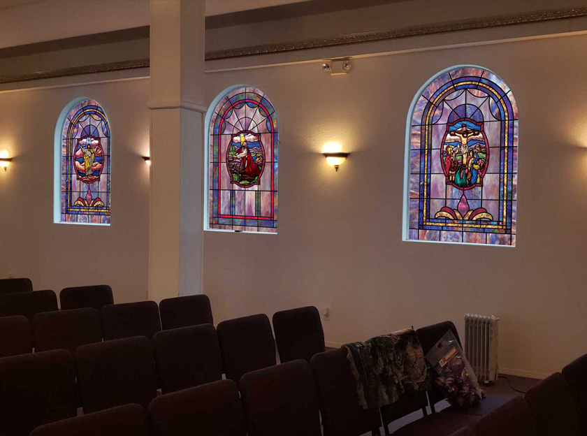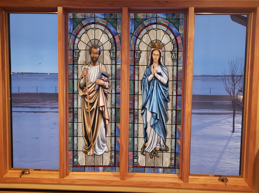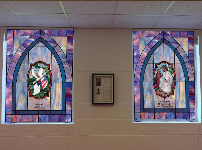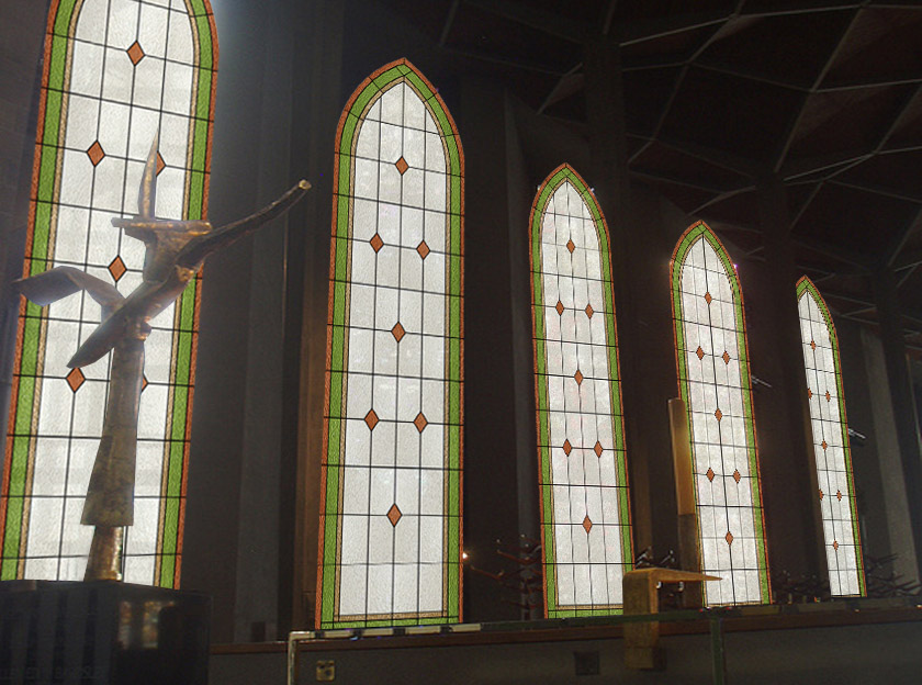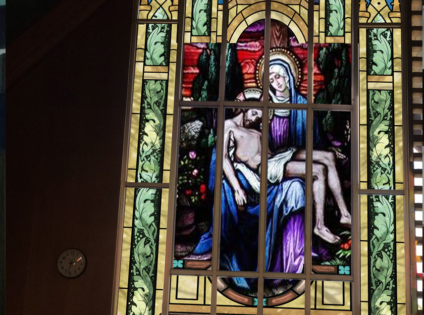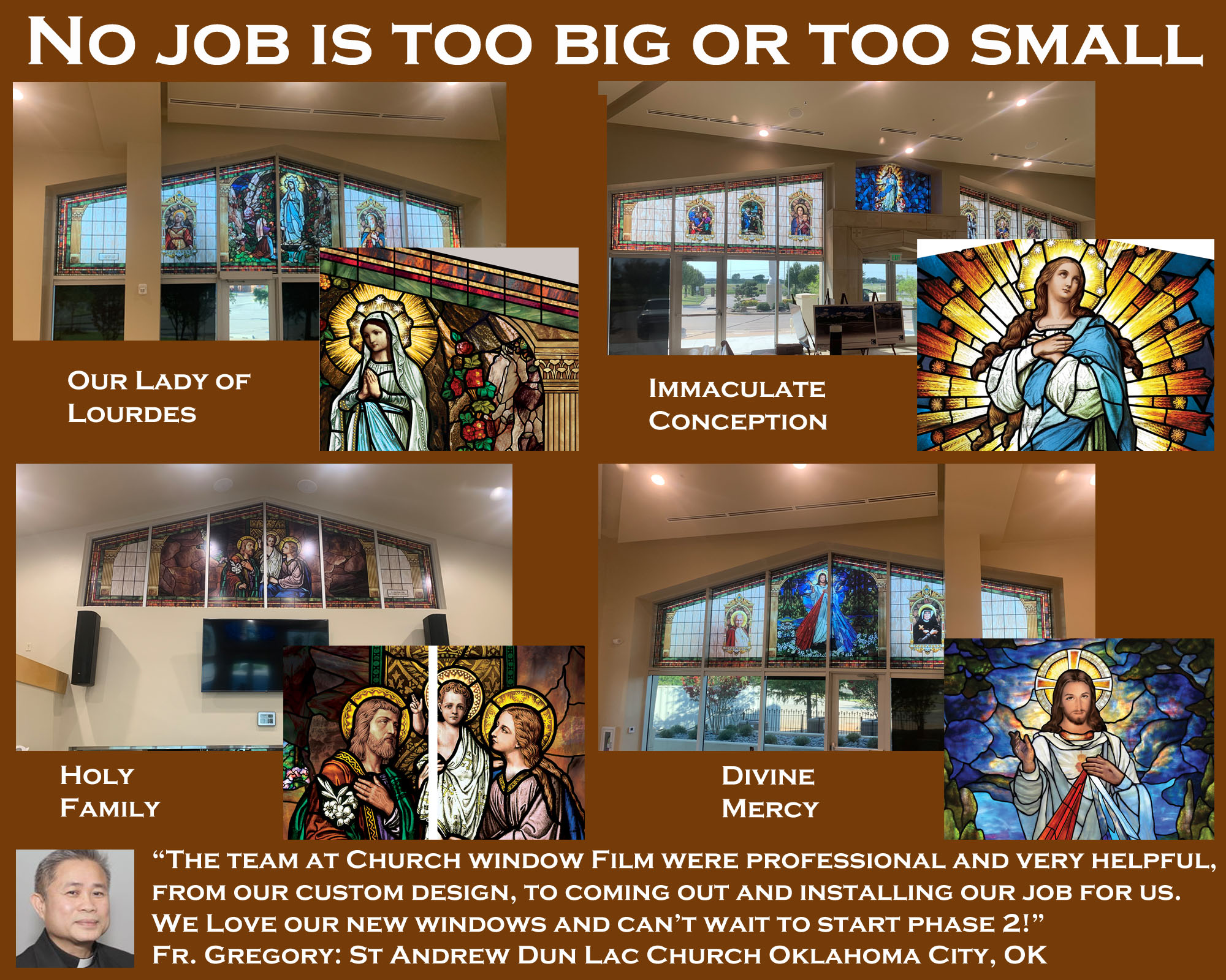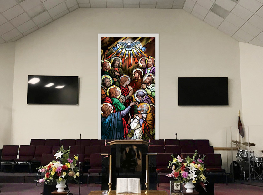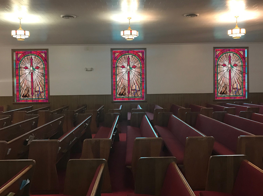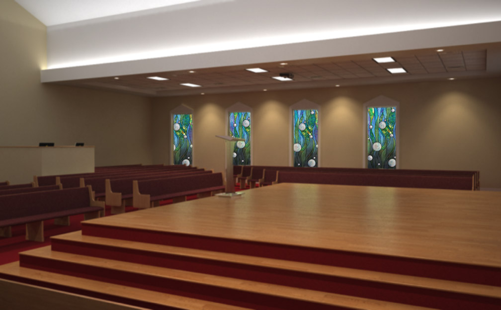 Our Church Window Film® designs transform spaces from small to large, arched or squared, double hung or solid, in any type of church or building. View our gallery photos below, highlighting various ways in which our films can be used, use these pictures for inspiration. All our designs can be transformed and configured into your size and shape window, CALL US at 800-291-3739 with any questions. Click HERE to view our NEW PINTEREST Page!!!