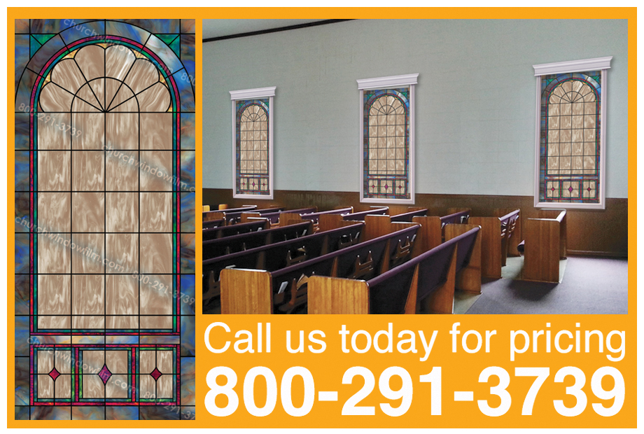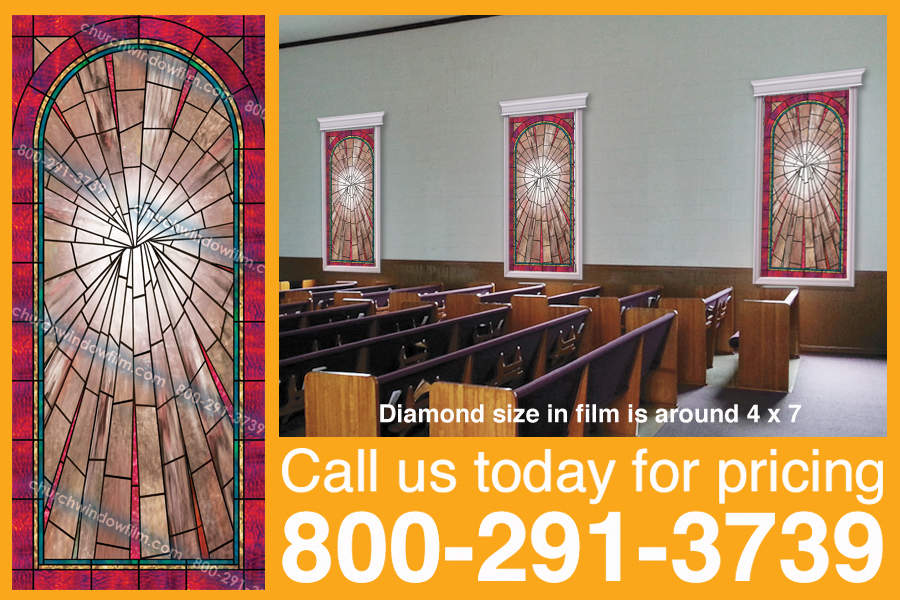 Designs are custom made to fit YOUR size and shape window, our plain film STARTS at $18 a square foot (specially marked designs only), other plain designs are $24 a s/f. For other pricing info CLICK HERE Consider adding a cross, diamond, medallion and/or scripture to your design for added decor. Click pic to the right for our gallery. Click on menu options above for more design options. For other questions, CONTACT US